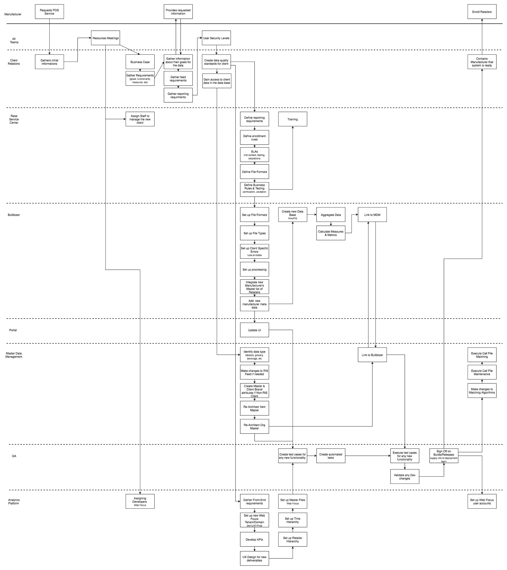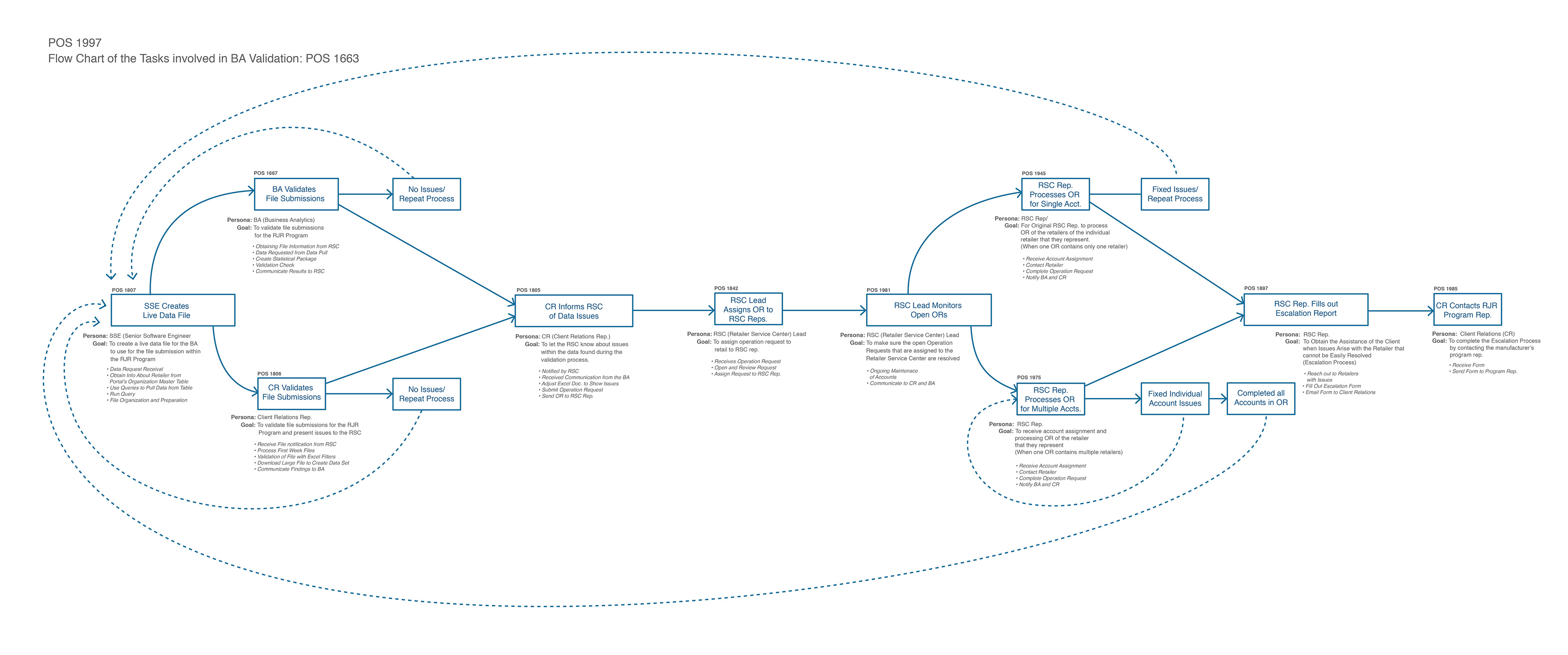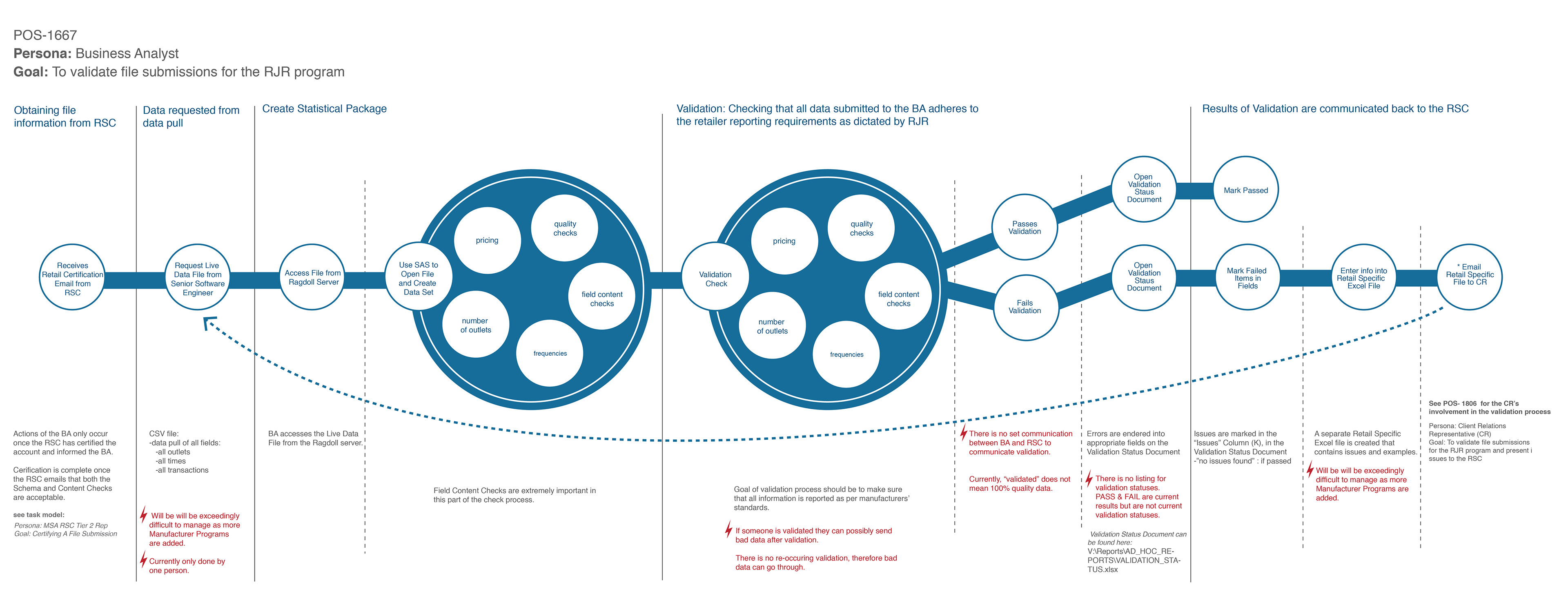 Both the file certification and the data validation checks for a data files submitted by retailers were manually completed. An RSC Rep was responsible for completing the file certifications, which meant manually viewing the submitted file and working with the retailer and potentially a client representative to alleviate any problems including data quality and format issues. Certification only had to occur for the initial data submission. After that, all the data quality checks got handled by the business analyst (BA). The BA would look at every submission. If there were any issues they would have to work with a client representative who would reach out to the retailer. After a submission was validated, the BA would have to inform an engineer that the data could get sent to the client. These processes didn’t work well, and a lot of poor quality data was getting sent to the client.